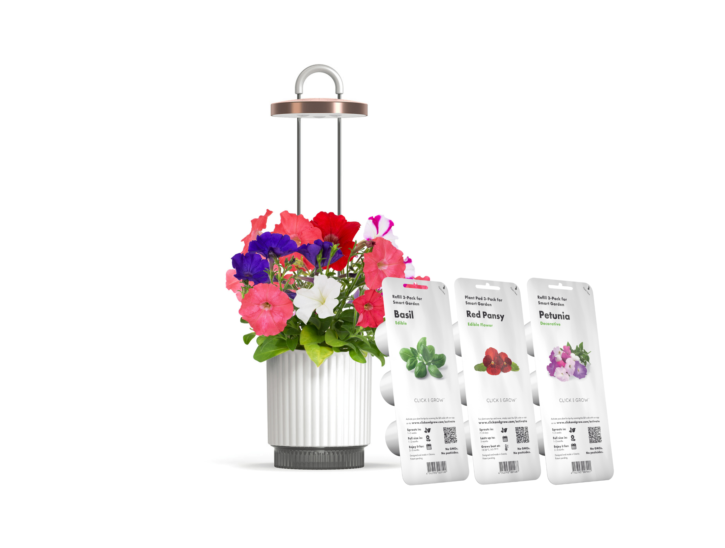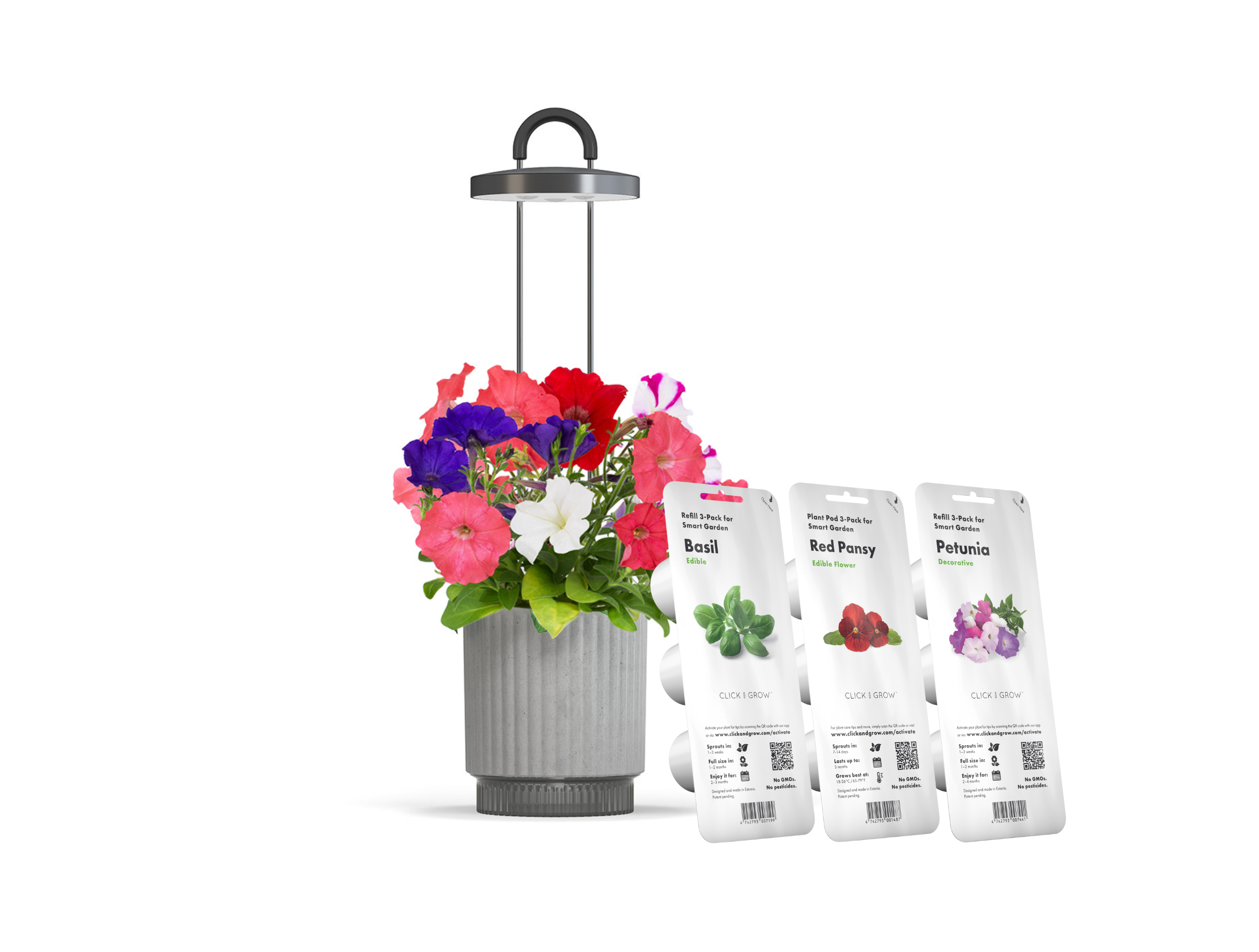1x Click & Grow Red Pansy, 1x Petunia, and 1x Basil Plant Pod 3-packs.